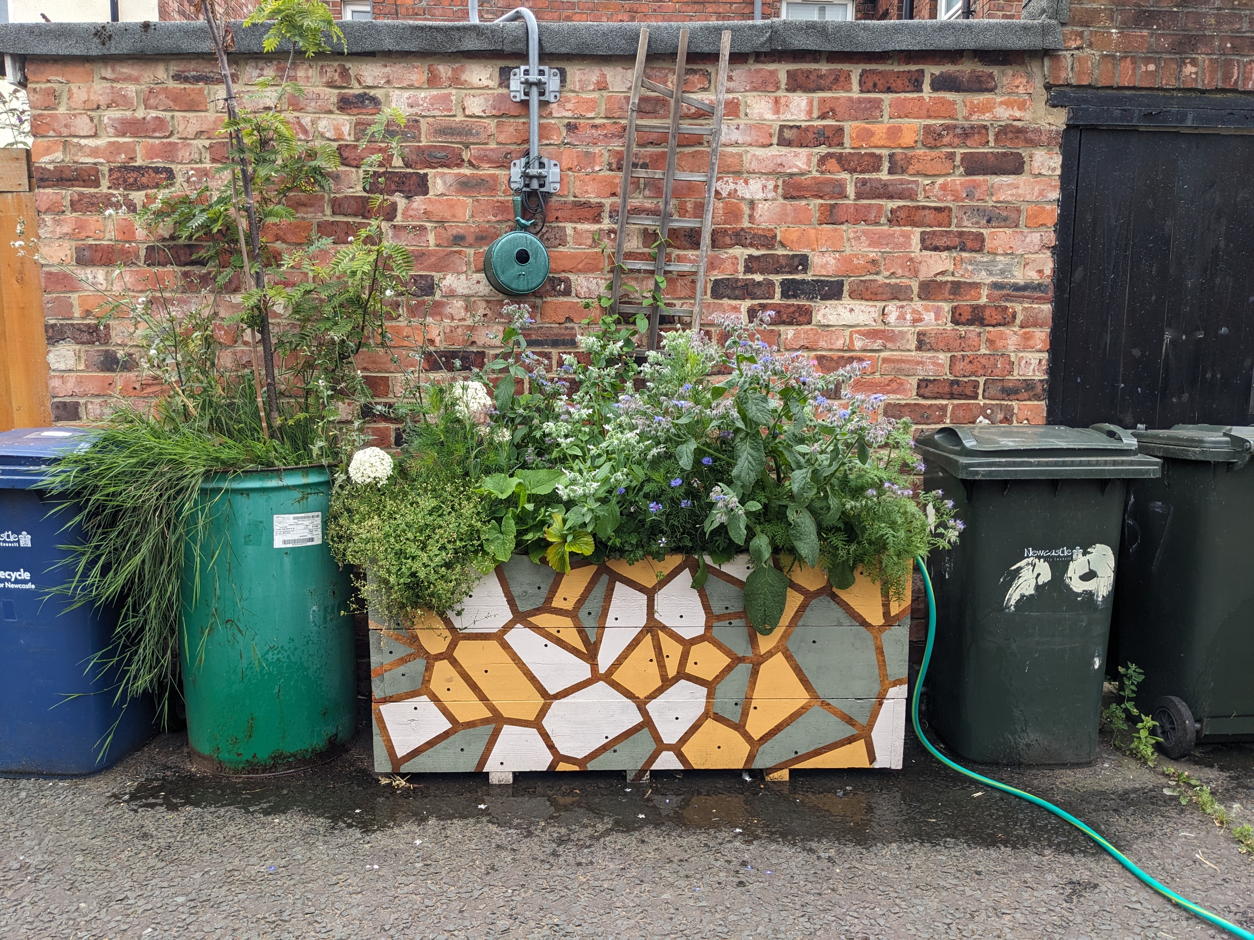 Opposite our back gate was a tatty old planter (ours) and a tree in a barrel.